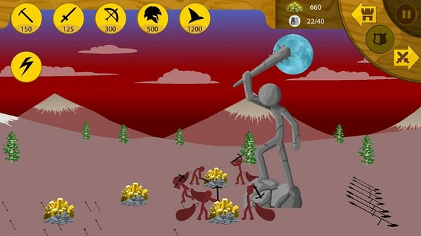 火柴人戰爭:遺產是一款比較經典的對戰塔防游戲,首先第一件事就是獲取資源,我們點擊屏幕左上角的“鋤頭”按鈕,可以召喚出挖礦的火柴人,它們拖著大包來挖礦,然后我們可以獲得更多的礦石召喚戰斗類的火柴人。