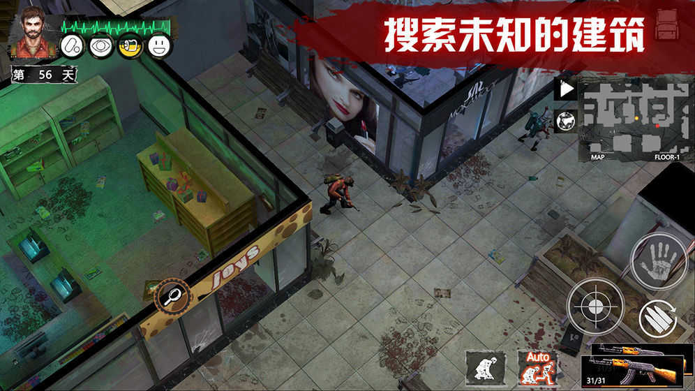 2、體力:體力為零時玩家戰死。體力只有被攻擊時才會流失,脫離戰斗則自恢復。制造的攻擊道具則可以更快擊殺僵尸,也間接影響體力流失。