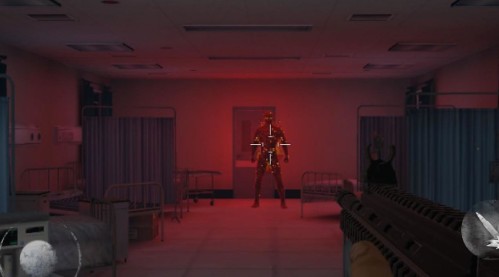 1、在一開始我們來到醫院當中,首先左右查看四周,之后走向大門。接著進行瞄準,干掉兩個小怪物