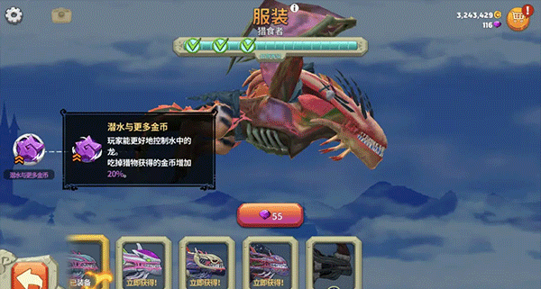 解鎖瘋狂服裝來飛得更快,噴出更猛的火焰,吃下更多獵物