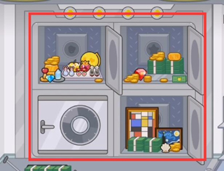 來到銀行二樓,打開保險柜,根據圖形找到鉆石,紅心,星星以及貝殼并依次放入,保險柜就會打開,里邊有很多寶物。