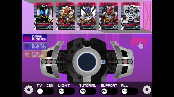 假面騎士黑暗帝騎是一款趣味2d假面騎士變身器模擬游戲,玩家能夠在游戲之中手中各種的物品道具來自由進行變身,實現自己的兒時夢想,體驗熱血沸騰的游戲戰斗,聆聽熟悉的變身音效,完成游戲歷險,自由搭配各種的道具來享受趣味休閑挑戰,有著震撼的游戲體驗。