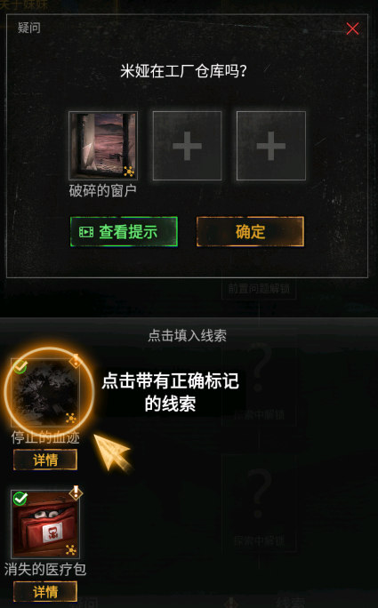 6、然后根據提示,依次點擊疑問和線索提示,閱讀仔細推理找到米婭