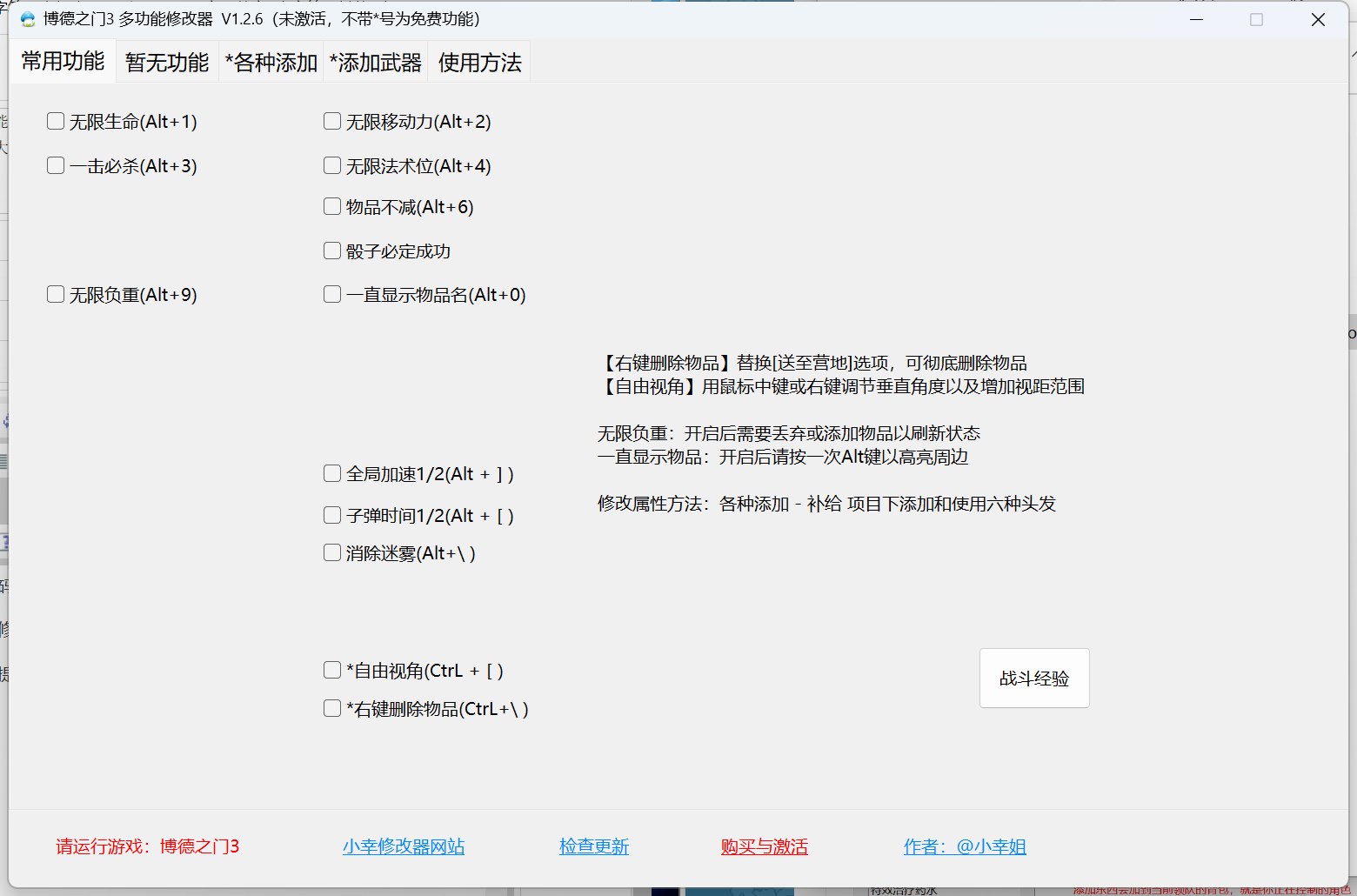 博德之門3多功能修改器小幸版v1.2.6,是一款專為熱門角色扮演游戲博德之門3設計的游戲輔助工具。該修改器由經驗豐富的開發者小幸精心制作,旨在為玩家提供一種便捷、高效的方式來增強游戲體驗,通過簡單操作即可實現對游戲內資源的修改和功能增強。
