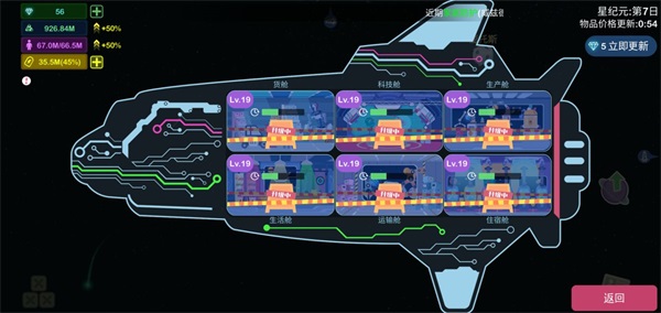 2、飛船功能。飛船可謂是這個(gè)游戲的核心部分了,一方面它決定了你的貨倉(cāng)、生產(chǎn)艙、生活艙、輸運(yùn)艙、住宿艙的大小,還決定著你可以探索周邊星空的范圍,隨著探索范圍的增大會(huì)發(fā)現(xiàn)更多的星球,增加貿(mào)易貨物的種類。