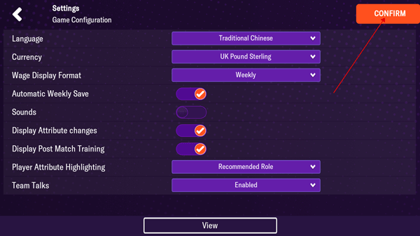 4、最后不要忘了點擊右上角的CONFIRM保存設置,完成后游戲就切換為中文了。