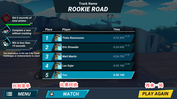 5、這里小編摔了個大跟頭,狗啃泥,得了個倒數第一。。這里可以看下剛剛的回放,或者快速再來一把!