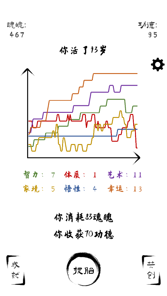 2、角色的年齡上限取決于玩家的選擇,結(jié)束以后就會(huì)顯示出這一世所有的數(shù)據(jù)。