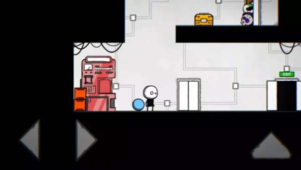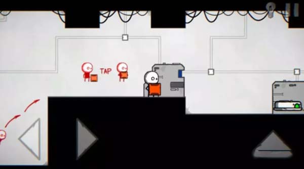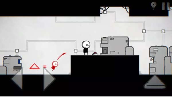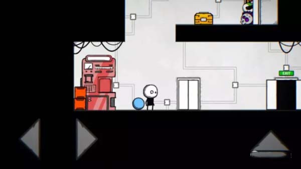 3、選擇第一關新手關卡進入游戲,游戲中的操作方式只有左右移動,跳躍,和用點擊屏幕的方式,將其他物品抓起來或者放下。碰到墻壁時可以掛在墻壁上繼續跳躍!按照新手提示跳上臺階后,看到腳下有一個按鈕,然后三眠就開始思考這個按鈕是控制哪個機關的。