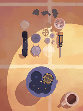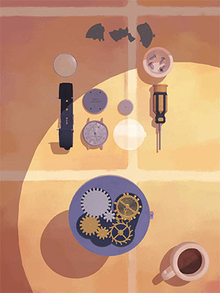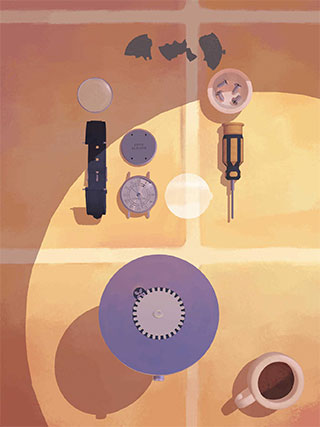 2、然后把所有的物件全都拆封出來,相信大家都會的,卸掉表帶,用螺絲刀把螺絲擰下來,把所有的部件都分開放在桌上。這時就會有一個動畫,安裝齒輪的地方碎了一地,然后他就會給你一個新的部件。記得要把所有的齒輪撿出來放好。