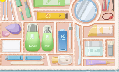 8、今日素顏這一關(guān)主要注意的點就是:左上角的棉棒收納,有一個是歪的,潤唇膏的蓋子是分開的;左下角指甲刀一個平一個尖,記得別放錯了;還有就是藍(lán)色瓶子精華有一個滴管,記得分開放;最后就是右上角的卡子和皮筋,玩家按照下圖的樣子收納即可。