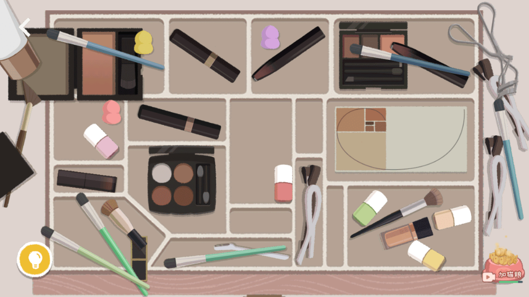 2、化妝品這關(guān)需要分門別類的擺放,還是遵循先處理比較大的物件的之后再處理小的的順序,注意眼影刷有顏色的順序。