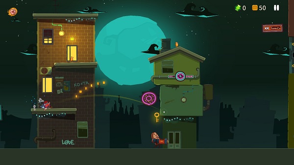 基本上玩家僅憑一根手指頭就能操縱,這里沒有上下左右的方向鍵,也沒有跳躍鍵,拖動主角會出現拋物線,之后您會進入“子彈時間”,周圍動態會變得很慢很慢,松開手,主角就會按照拋物線的軌跡彈射出去,而且可以粘在任何地方。