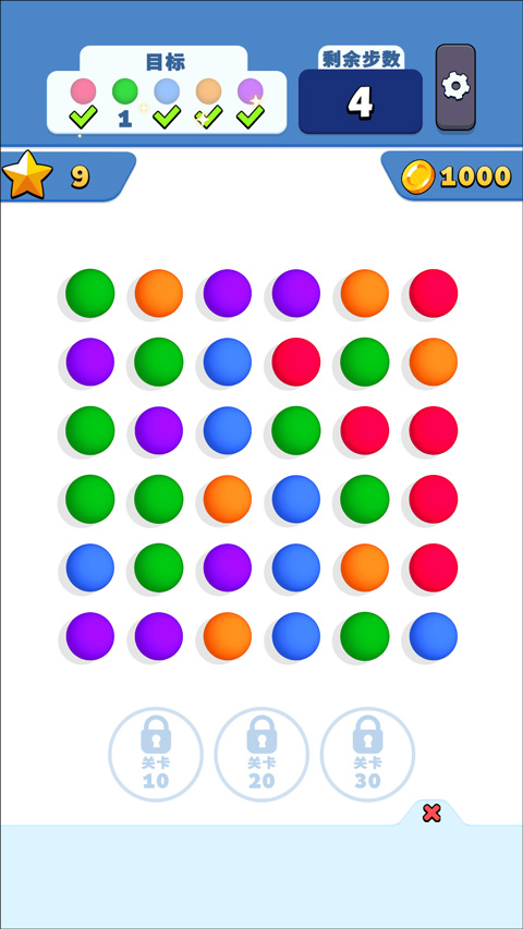 1、點擊開始進入游戲,玩法很簡單,將相同顏色的球球連接在一起即可消除,但是不能交叉,完成對應的目標即可通關