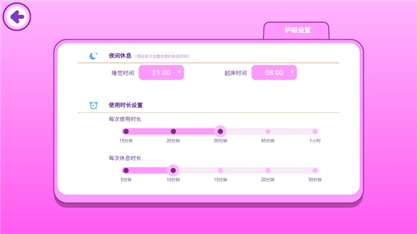 8、家長可以進行使用時長,休息時長等設置,控制孩子玩游戲的時間。