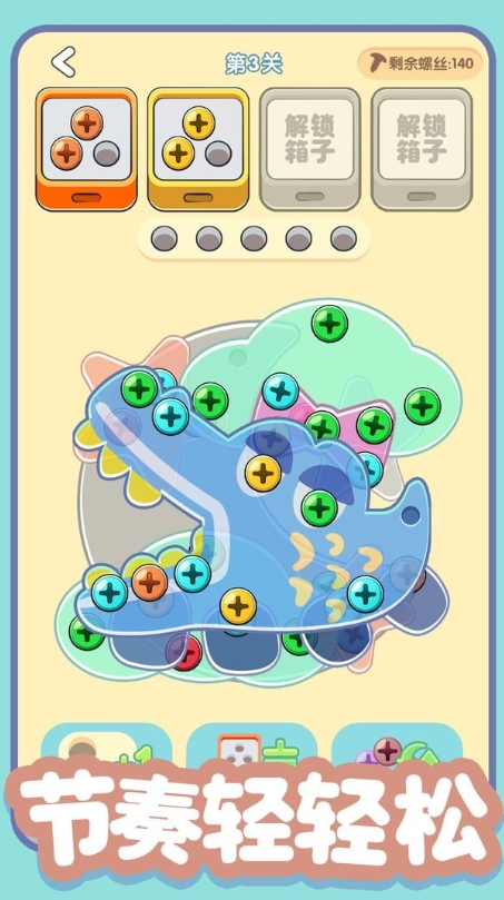 不斷進行新箱子的解鎖,這些新箱子之中將可放置其他顏色的螺絲,以保證玩家更快完成游戲;