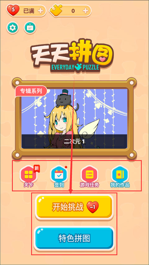 1、進入游戲后,擁有關卡模式和特色拼圖模式供玩家們選擇,點擊“開始挑戰”即可挑戰關卡;