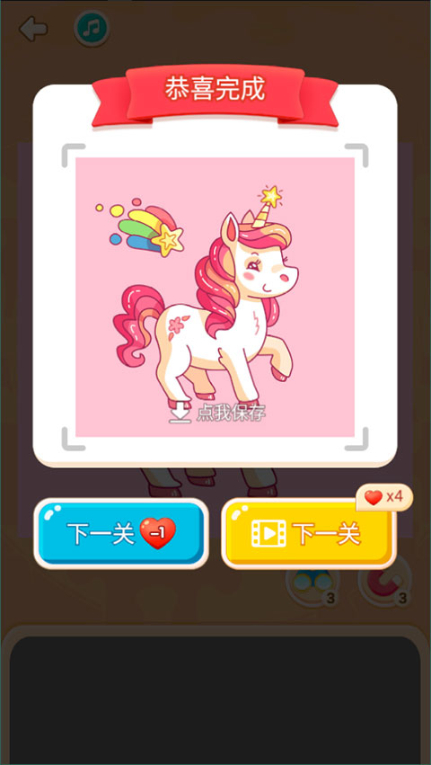 4、成功拼圖后,會結算當前拼圖的時間和獎勵,同時解鎖下一個關卡,如果喜歡該拼圖還可以點擊保存至相冊中;