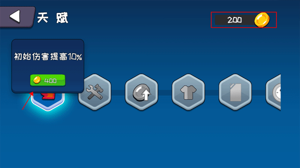6、現在要介紹的游戲玩法就是游戲主界面左下方的三個功能按鈕:強化、皮膚、和芯片。強化可以讓機器人的天賦初始傷害值提高10%,不過需要右上角的金幣數量達到購買的數值。