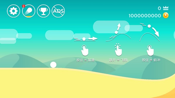 從沙丘上飛起并達到一定的高度獲得分?jǐn)?shù),不過飛的越高就越危險,小球垂直硬著陸的話游戲就將會結(jié)束。