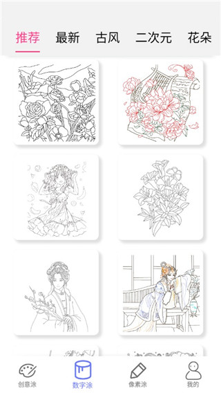 圖片每個區域都有對應的顏色和數字提示,根據數字的顏色點擊區域即可涂色該區域,涂色完成后,用戶可以分享和保存該圖片。大量古風,二次元精美圖片。