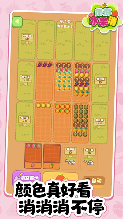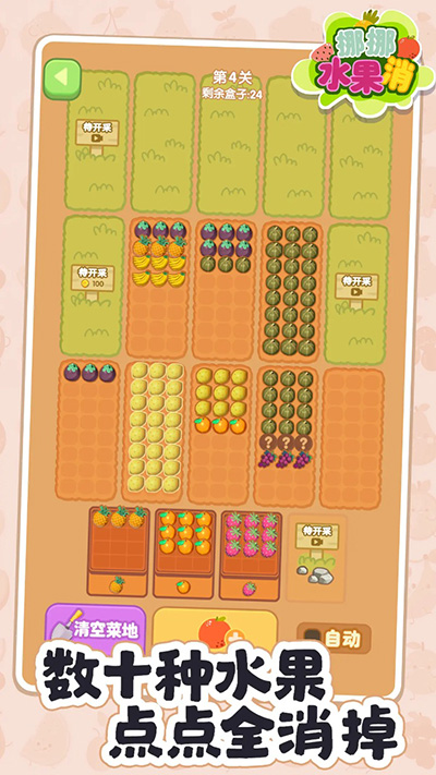 挪挪水果消是一款休閑分類消除闖關(guān)游戲,游戲中玩家可以挑戰(zhàn)不同的趣味消除關(guān)卡,玩家需要將相同種類的水果擺放到一個相同的農(nóng)田之中即可完成消除,游戲可以給玩家?guī)硎州p松解壓的消除闖關(guān)體驗,游戲玩法簡單有趣,玩家只需要簡單的點擊即可自由挑戰(zhàn),感興趣的玩家快來下載試試吧!