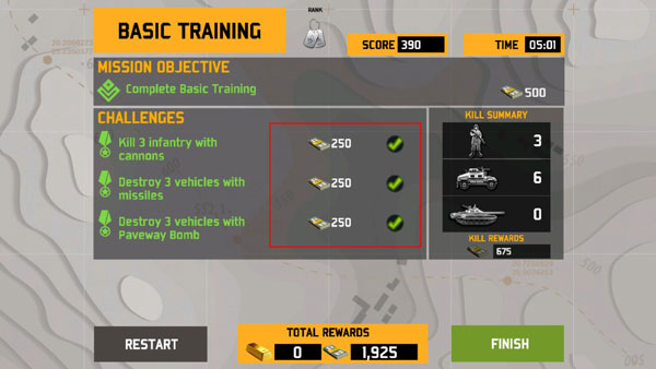 進入ARMS RACE并在游戲中挑戰其他飛行員,進行激動人心的PVP戰斗。在這種同步多人游戲模式中,5名玩家將通過10個隨機挑戰的挑戰,每個挑戰都有不同的武器。完成率最高的飛行員,獲勝!