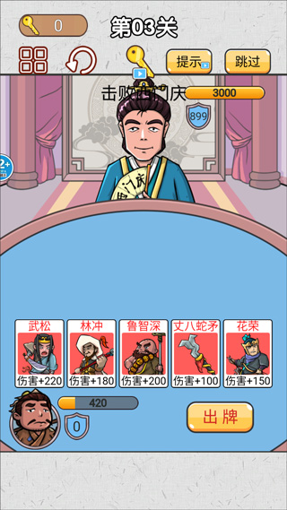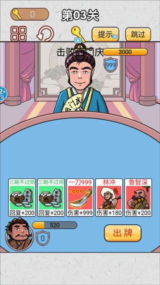 4、不同的卡牌,擁有不同的組合,如鐵戒刀+武松可以合成一刀999