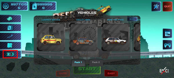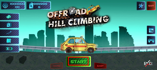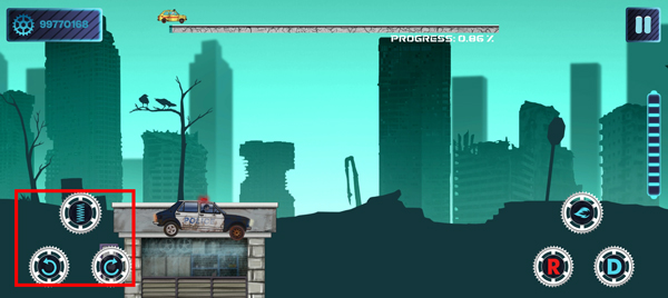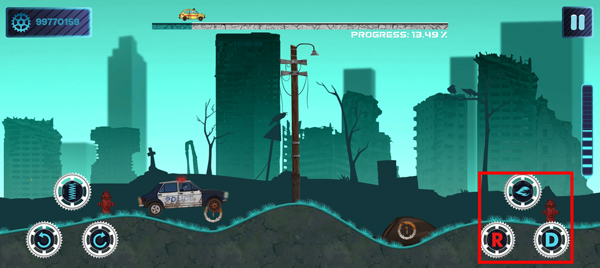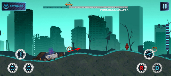 2、進入游戲之后,利用屏幕上的按鍵控制車輛前進,左下角的按鍵分別是車輛的跳躍,翹頭和翹尾按鈕,都是用來控制車輛防止翻車的;