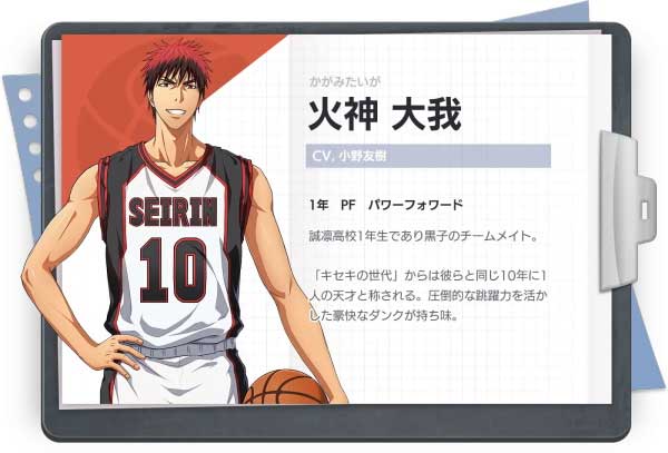 從美國回到日本的他與第一主人公黑子哲也是搭檔關(guān)系,是與命運(yùn)之影相遇的真正的光,同時(shí)也是誠凜高校的新生王牌。