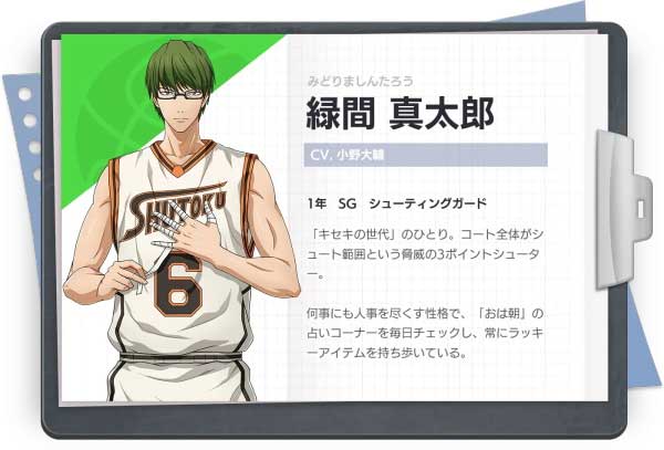 現(xiàn)屬秀德高校一年級的王牌選手,原帝光中學(xué)籃球部「奇跡的世代」五人中的一人,左手總纏著繃帶。 很相信晨間占卜,被人們稱為“三分神射手”,曾擔(dān)任帝光中學(xué)籃球部副隊(duì)長。