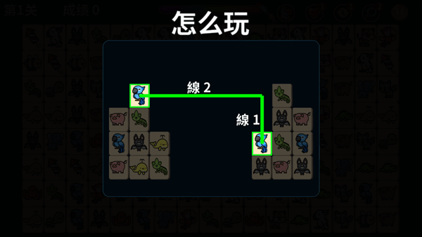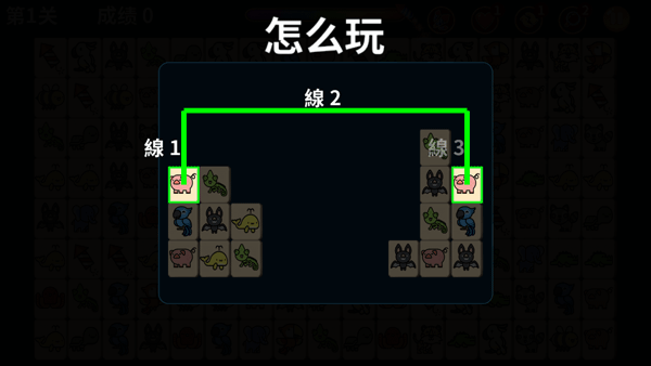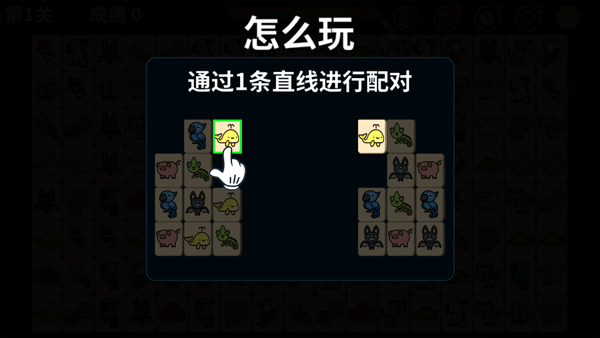 2、這時頁面上出現了的新手引導,教大家如何去玩這款游戲,玩家需要以下三種直線進行配對才能消除小動物。