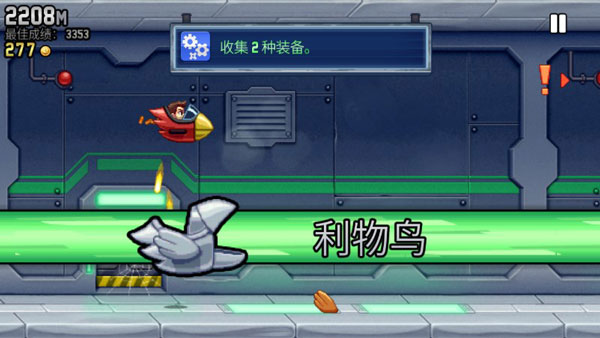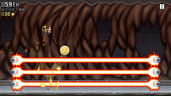 2、輕觸任何位置開始游戲,點擊屏幕人物就會往上飛,當不點屏幕就會降下,依據金幣和道具的位置來進行調節,游戲而類似于像素鳥的玩法,但還加入了射擊功能。期間遇到有電流的障礙,需要躲避,不能出碰,不然游戲GG,