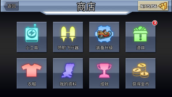 6、在商場中還能看見小工具、噴射飛行器,裝備升級,道具,衣服等相關選項,依據自己的喜歡進行購買升級,從而讓你的飛行人生更加舒暢,以上就是火箭飛人最新版的玩法了。