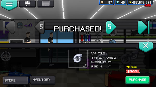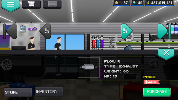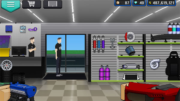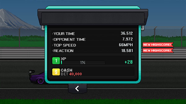 1、在像素賽車手最新版游戲中,首先是全局的變化,現在進去車庫或者商店等都會有一個類似翻頁的過場動畫,其次是游戲的幀數更高了,玩起來比以前更流暢