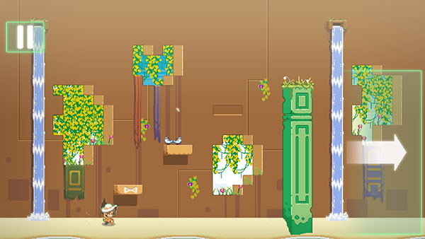 《尋找埃文》中的跳躍解謎關卡簡單易懂、上手就會,根本不需要任何引導和教程。具體玩法是通過跳躍踩踏具有各種特點的平臺,最終越過最右方的柱子,通過關卡。