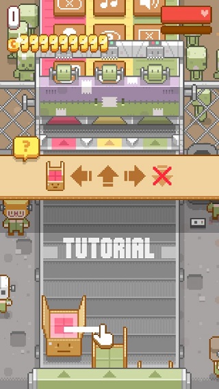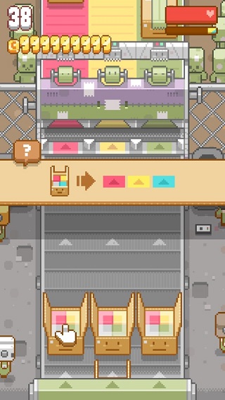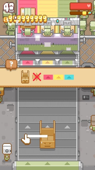 一款超可愛的像素風格的休閑模擬游戲,游戲中傳送帶上有著不同顏色的箱子,