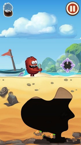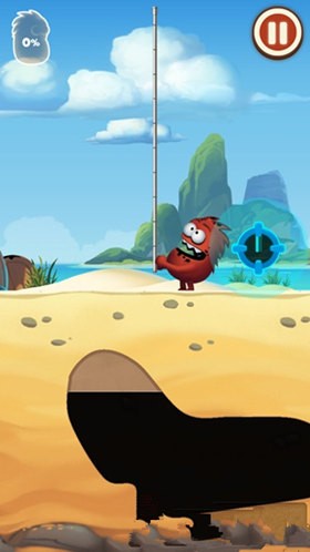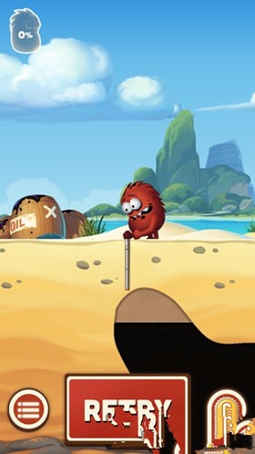 1、采油小怪2游戲中小怪物出來的時候,手里會拿著一個可以伸縮的導管,有些像孫悟空的如意金箍棒一樣,我們來到有石油的上方,按住屏幕中出現的按鈕,就可以讓導管邊長。