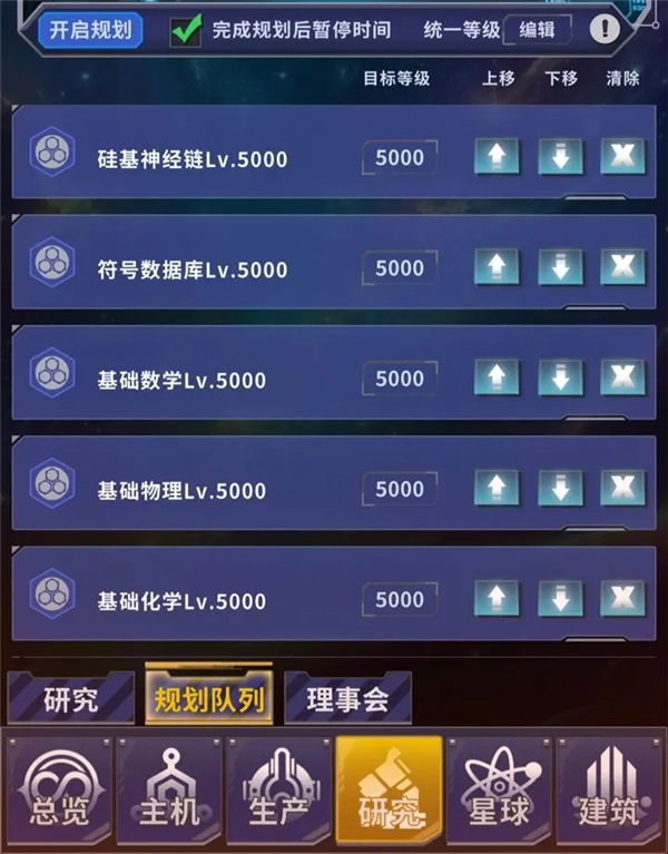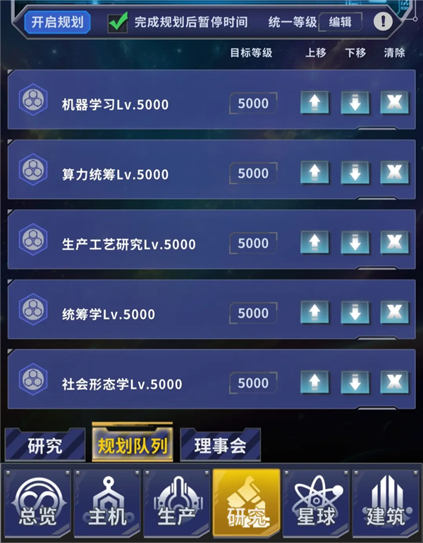 感謝羈池魚(yú)大佬的提點(diǎn)。用法如圖所示,順著排列這十項(xiàng)研究即可。開(kāi)局使用研究的自動(dòng)晉升,設(shè)定等級(jí)800,升到四大類(lèi)最后一項(xiàng)后轉(zhuǎn)為規(guī)劃隊(duì)列,通過(guò)多次修改統(tǒng)一等級(jí)的方式解放雙手。
