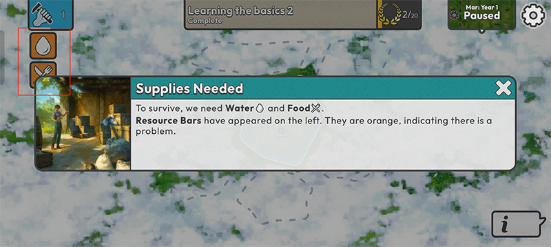 3、為了生存,我們需要水和食物。左側出現了資源條。它們是橙色的,表示出現了問題。