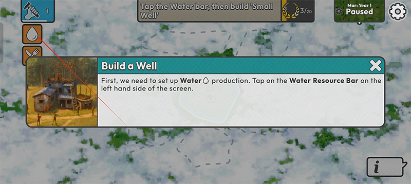 4、首先建造一口水井,點擊屏幕左側的水資源欄。