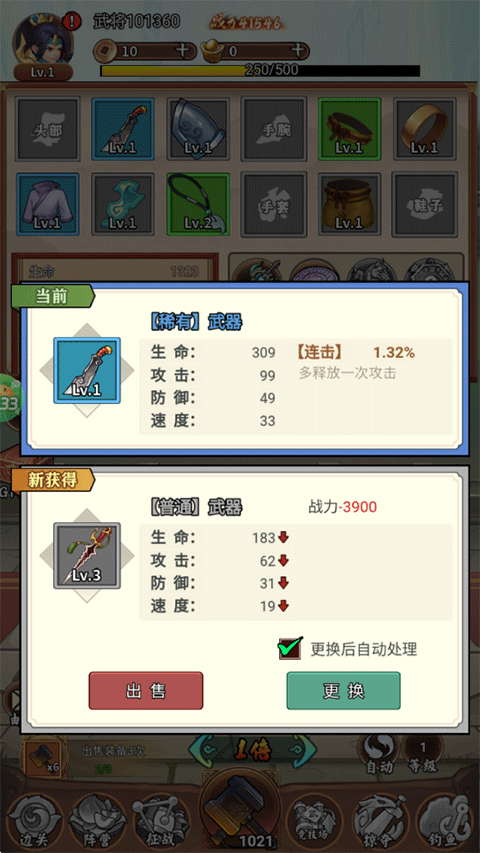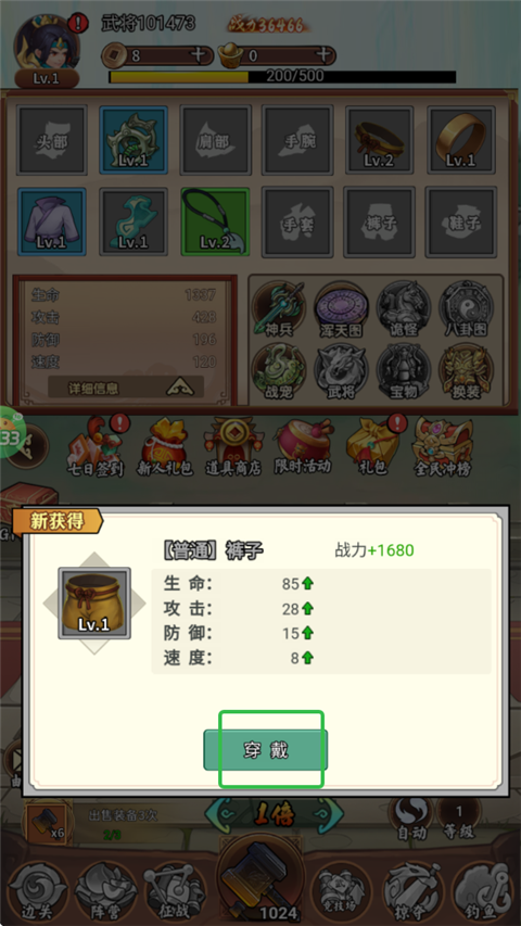 5、品質(zhì)高可以增強戰(zhàn)力的裝備用來穿戴,品質(zhì)低的可以進(jìn)行售賣;