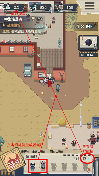 玩家可以選擇下方的僵尸進行釋放,點擊地圖上自己想要進攻的位置釋放即可,釋放僵尸需要能量,左上角會自動恢復能量,右下角為釋放僵尸需要能量。