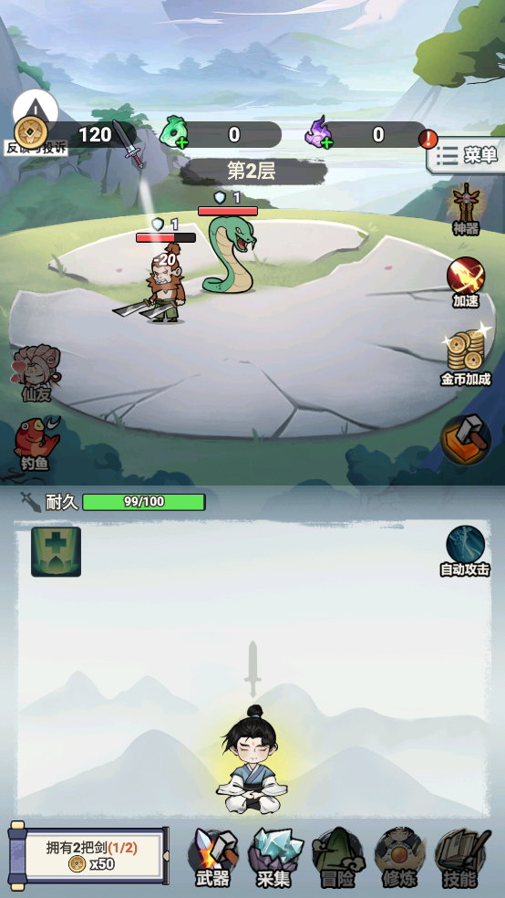4、劇情豐富多彩,五臟俱全,玩家將會體驗到扣人心弦的故事情節;開局盡量多的練劍數量,金幣獲取速度應對練劍數量增加欄位實在無力時開始強化升級。
