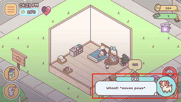 4、返回袋中愛游戲界面,點(diǎn)擊寵物,可看到右下角出現(xiàn)寵物的對(duì)話框,以上就是袋中愛和寵物打招呼的方法了。