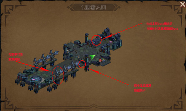 2、與雕像對話觸發獎勵,踩中血跡觸發隱藏關卡,擊敗boss后與墻體對話觸發隱藏boss。