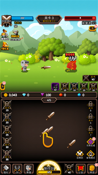 將自動制造的劍放到合成面板,然后將它們拖到相同的劍上,然后將它們合成以制作更堅固的劍。通過無盡的合成,召喚更加強大的寶劍,以擊敗即將來臨的敵人。