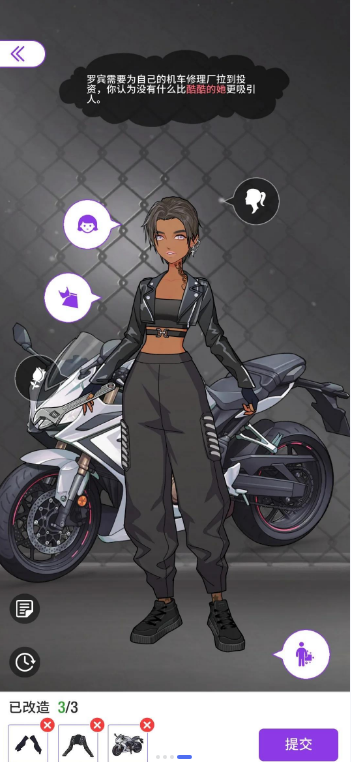 羅賓的機(jī)車修理廠需要投資,她認(rèn)為沒(méi)有什么比酷酷的她更能吸引投資了。你需要幫助她展示自己的魅力,吸引投資者的注意。