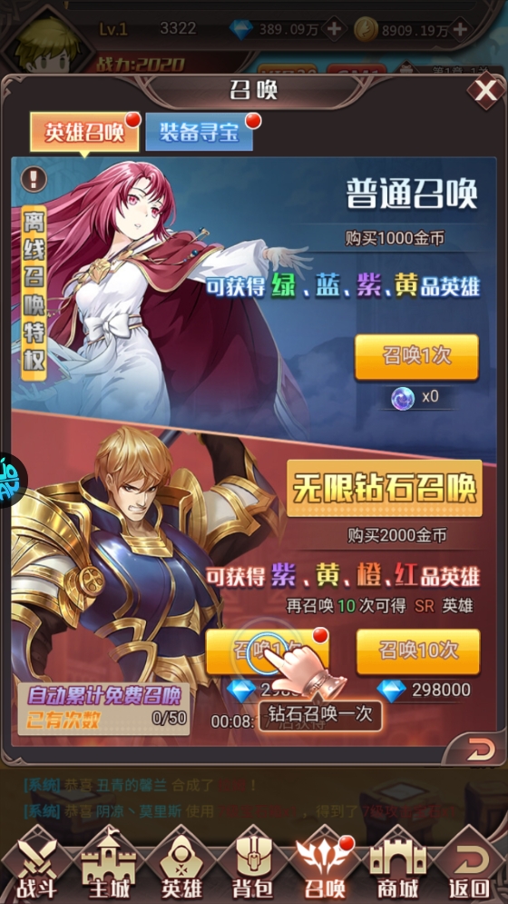 5、點擊召喚功能即可召喚英雄,不斷擴充你的勇士隊伍,為守衛王國集結更強力量。