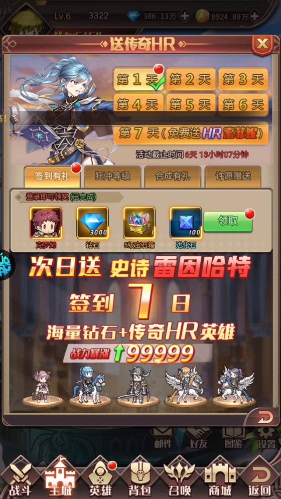 7、每日簽到可領取豐厚獎勵,連續簽到7天更能收獲海量鉆石與傳奇HR英雄,讓你的冒險如虎添翼。